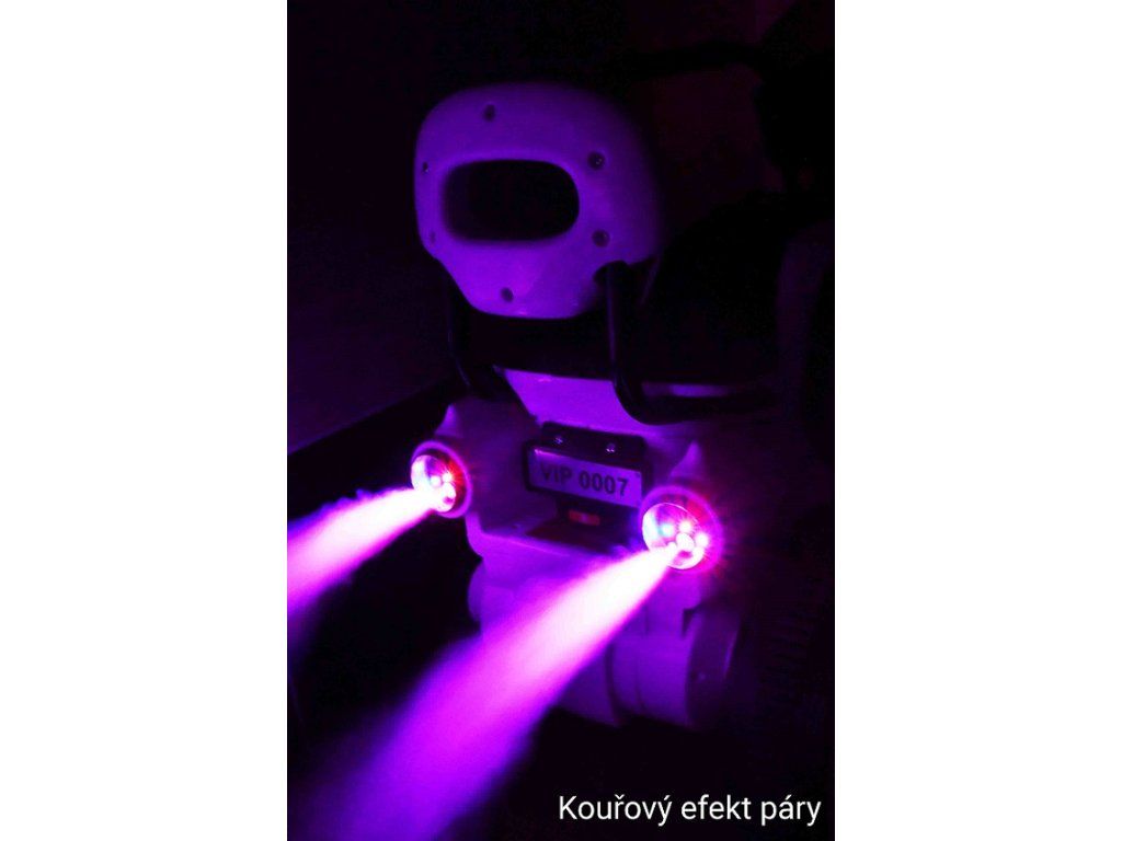 Efekt páry získáme naplněním trysek (kouřovodu). Stlačením středu trysky otevřeme nádržku a za stálého držení středu trysky nalijeme 1dcl destilované vody do nádržky. Vodu doplníme do obou postranních trysek. Po zapnutí zeleného spínače na předním ovládacím panelu se z trysek začne uvolňovat pára.