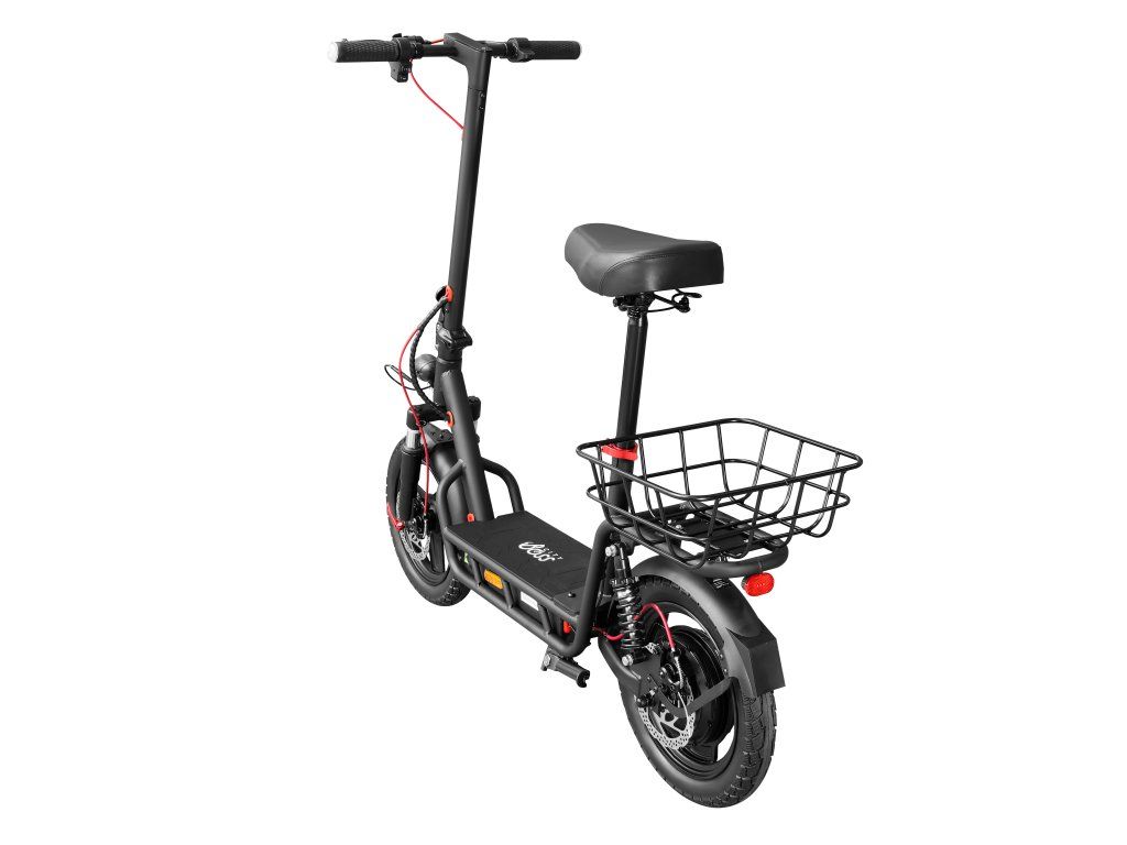 Ve výbavě nechybí ani praktický stojánek pro snadné odstavení koloběžky, když ji zrovna nepoužíváte. Úložný košík na zadním nosiči se skvěle hodí pro drobné nákupy nebo převážení věcí do hmotnosti 5 kg.