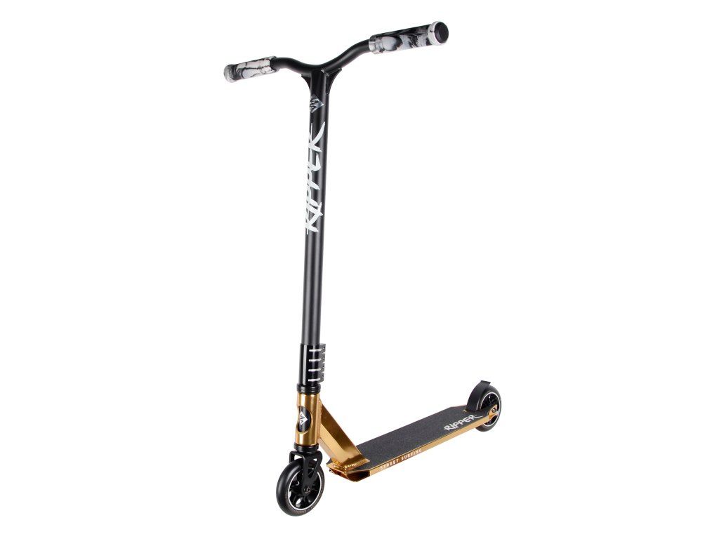 Freestyle koloběžka Ripper vyniká kvalitou zpracování, robustností a jedinečným designem s CNC otvorem. S vyztuženými řídítky širokými 54 cm a hlavovým složením s technologií HIC je předurčena pro jízdu ve skate parku a triky. Kolečka 110 mm s ložisky ABEC 9 a s kovovými jádry garantují dostatečnou pevnost a rychlost při skocích.VLASTNOSTI: