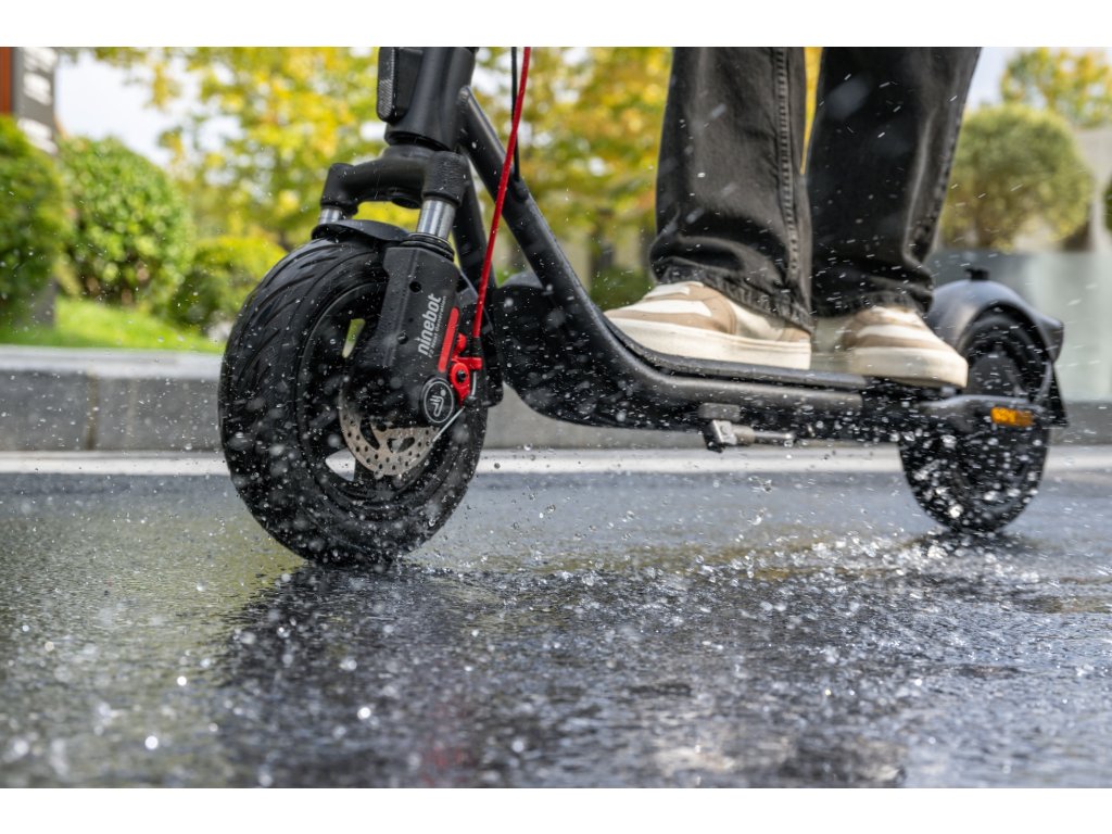 Díky konstrukci z vysoce pevné oceli je eKickScooter IPX5 voděodolný a připravený k použití v náročných výzvách za každého počasí.  [4]
